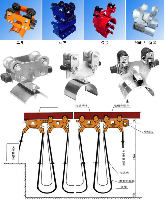 GHC系列工字鋼電纜滑車分為中載荷型、重載荷型、和輕載荷型,因此滑車走輪為Ф80、Ф63、Ф50的三種,承載能力≤50~150kg,每類按托板層數(shù)分為單層、雙層、三層,每類中有三種形式,首端為電纜牽引車,終端為固定掛線架,中間為電纜滑車。